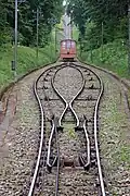 Funicular de Heidelberg, Alemanha (secção superior). Destaca-se o cabo e o cruzamento das vias.