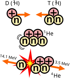 | 2H + T | ⟶ 4He (3,52 MeV) | 3,52 MeV | + n (14,1 MeV) | 17,6 MeV |