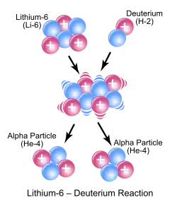 A última das duas equações era desconhecida quando os EUA realizaram o teste da bomba de fusão Castle Bravo em 1954. Sendo apenas a segunda bomba de fusão já testada (e a primeira a usar lítio), os projetistas da "Shrimp" de Castle Bravo entenderam a utilidade do 6Li na produção de trítio, mas falharam em reconhecer que a fissão do 7Li aumentaria grandemente o rendimento da bomba. Embora o 7Li tenha uma pequena seção de choque de nêutrons para energias de nêutrons baixas, ele possui uma seção de choque maior acima de 5 MeV.[8] O rendimento de 15 Mt foi 150% maior do que os 6 Mt previstos e causou uma exposição inesperada à radiação (fallout).