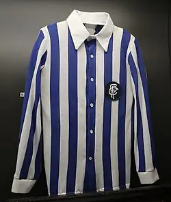 A primeira equipa de futebol do FC Porto era composta por oito jogadores com camisolas brancas e colarinhos vermelhos, dois com camisolas listadas azuis e brancas e um de encarnado. Nos primeiros anos, predominava o vermelho, “à Arsenal”, embora também se tenha usado verde, as cores da cidade. Em 1909, José Monteiro da Costa, que defendia o azul e branco por representarem as cores da monarquia, oficializou estas cores, ignorando o uso das cores da cidade.[115]