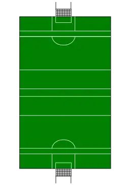 O relvado é retangular, mede 130 metros de comprimento e 90 de largura. As traves tem forma de H com uma rede na seção inferior. As linhas são marcadas em distâncias de 13m, de 20m e de 45m de cada linha lateral.[2]