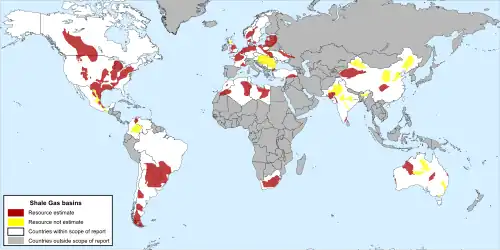O volume total de reservas de gás não-convencional no mundo é de aproximadamente 5 975 trilhões de pés cúbicos. Essas reservas estão geograficamente distribuídas como segue: