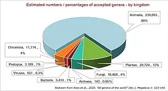 Os totais para "todos os nomes" e estimativas para "nomes aceitos", conforme listados no Interim Register of Marine and Nonmarine Genera (IRMNG), são detalhados na publicação de Rees et al., 2020, mencionada acima. As estimativas de nomes aceitos são as seguintes, divididas por reino:
