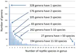 O número de espécies em gêneros varia consideravelmente entre grupos taxonômicos. Por exemplo, entre os répteis (não-avianos), que têm cerca de 1 180 gêneros, a maioria (>300) tem apenas 1 espécie, ~360 têm entre 2 e 4 espécies, 260 têm entre 5 e 10 espécies, ~200 têm entre 11 e 50 espécies e apenas 27 gêneros têm mais de 50 espécies. No entanto, alguns gêneros de insetos, como os gêneros de abelhas Lasioglossum e Andrena, têm mais de 1 000 espécies cada. O maior gênero de plantas com flores, Astragalus, contém mais de 3 000 espécies.[21]