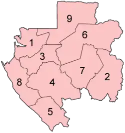 O Gabão está dividido em 9 províncias, dirigida cada uma por um governador, eles mesmos subdivididos em departamentos dependendo de um prefeito e, às vezes, em distritos, dependendo de um sub-prefeito. Alguns Gaboneses apresentam uma brincadeira que a Guiné Equatorial, como a "G10", a décima província do Gabão.
