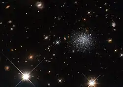 Galáxias anãs ultracompactas (UCD) são uma classe de galáxias muito compactas com densidades estelares muito altas, descobertas[23][24][25] na década de 2000. Acredita-se que tenham cerca de 200 anos-luz de diâmetro, contendo cerca de 100 milhões de estrelas.[26] É teorizado que estes são os núcleos de galáxias elípticas anãs nucleadas que foram despojadas de gás e estrelas periféricas por interações de maré, viajando através dos corações de aglomerados ricos.[27] UCDs foram encontrados no Virgo Cluster, Fornax Cluster, Abell 1689 e Coma Cluster, entre outros.[28] Em particular, uma amostra sem precedentes de aproximadamente 100 UCDs foi encontrada na região central do cluster Virgo pela equipe Next Generation Virgo Cluster Survey. Os primeiros estudos relativamente robustos das propriedades globais dos UCDs de Virgem sugerem que os UCDs têm propriedades dinâmicas[29] e estruturais[30] distintas dos aglomerados globulares normais. Um exemplo extremo de UCD é M60-UCD1, a cerca de 54 milhões de anos-luz de distância, que contém aproximadamente 200 milhões de massas solares em um raio de 160 anos-luz; sua região central contém estrelas cerca de 25 vezes mais próximas do que as estrelas da região da Terra na Via Láctea.[31][32] M59-UCD3 é aproximadamente do mesmo tamanho que M60-UCD1 com um raio de meia luz, r h, de aproximadamente 20 parsecs, mas é 40% mais luminoso com uma magnitude visual absoluta de aproximadamente -14,6. Isso torna M59-UCD3 a galáxia mais densa conhecida.[33] Com base nas velocidades orbitais estelares, afirma-se que dois UCDs no Aglomerado de Virgem têm buracos negros supermassivos pesando 13% e 18% das massas das galáxias.[34]