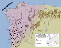No tempo dos romanos a província da Galécia tinha como limites, ao sul o rio Douro, a oeste e norte o Atlântico, enfim a este o cursos dos rios Esla e Cea e os Picos da Europa.[3] Embora a cultura castreja tivesse uma área de difusão muito mais extensa, até ao centro de Portugal, como na região de Viseu, Seia.[a][8] Na ótica dos conquistadores romanos a região era um "finis terrae" ou seja uma região bárbara por ser isolada o que explicaria por si a sua originalidade.