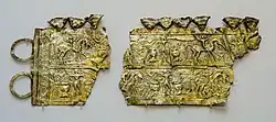 Mas a arte principal que deu fama aos galaicos é uma arte menor, a ourivesaria,[28] com a realização de torques, braceletes, diademas, brincos e colares articulados… com diversas técnicas: o estampado repuxado, filigrana, granulado.