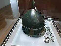 A descrição de Estrabão enquadra-se com as estátuas de guerreiros, os achados arqueológicos de armas e do diadema de Moñes em ouro encontrado em Moñes (Piloña), com um baixo-relevo com a representação de cavaleiros com cetras e elmos de três penachos.[3]