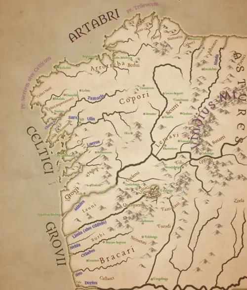 - 1 2 3 4 5 6 7 8 9 10 11 12 13 14 15 16 Plínio, o Velho História Natural, livro III, 28 “Iunguntur iis Asturum XXII populi divisi in Augustanos et Transmontanos, Asturica urbe magnifica. in iis sunt Gigurri, Paesici, Lancienses, Zoelae. numerus omnis multitudinis ad CCXL liberorum capitum. Lucensis conventus populorum est sedecim, praeter Celticos et Lemavos ignobilium ac barbarae appellationis, sed liberorum capitum ferme CLXVI. Simili modo Bracarum XXIIII civitates CCLXXXV capitum, ex quibus praeter ipsos Bracaros Bibali, Coelerni, Callaeci, Equaesi, Limici, Querquerni citra fastidium nominentur. “