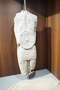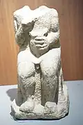 - Estátuas sedentes: São pessoas sentadas numa cadeira de espaldar com um arco e um cervo gravado, um vaso na mão e com as pernas da frente da cadeira com cascos de cavalo… Temos só seis representações masculinas dessas, duas provém de Ginzo de Límia as outras de Braga, da Póvoa de Lanhoso, de Santa Maria de Galegos em (Barcelos) e a ultima de Perafita, mais duas femininas de Briteiros e Felgueiras. Essas representações tinham uma função funerária de tradição mediterrânea.[26]
