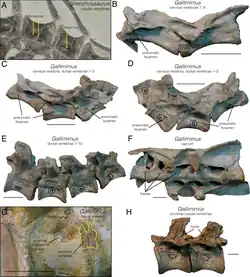 O Gallimimus tinha 64 a 66 vértebras em sua coluna, menos do que outros ornitomimídeos. Os centros (ou corpos) das vértebras eram planos na extremidade anterior e côncavos na extremidade posterior, exceto pelas seis primeiras vértebras caudais (cauda) — onde a superfície posterior também era plana — e aquelas na extremidade da cauda — que eram anfiplatianas com ambas as superfícies planas. Muitos dos centros tinham forames (aberturas que também foram chamadas de "pleuroceles") e, portanto, eram provavelmente pneumáticos (com suas câmaras ocas invadidas por sacos aéreos). O pescoço consistia em dez vértebras cervicais, todas longas e largas, exceto pelo osso atlas (a primeira vértebra que se conecta com a parte posterior do crânio). O atlas diferia dos outros ornitomimídeos porque a superfície frontal de seu intercentro era inclinada para baixo em direção às costas, em vez de ser côncava e voltada para cima para sustentar o côndilo occipital. O pescoço parece ter sido proporcionalmente mais longo em relação ao tronco do que em outros ornitomimídeos. O pescoço era dividido em duas seções distintas: as vértebras cervicais na frente tinham um centro quase triangular em vista lateral e afilavam em direção à parte posterior, bem como arcos neurais baixos e zigapófises curtas e largas (os processos que se articulavam entre as vértebras); as vértebras cervicais na parte posterior tinham centros em forma de carretel que se tornavam gradualmente mais altos, e zigapófises longas e finas. Os forames pneumáticos aqui eram pequenos e ovais, e as espinhas neurais projetando-se para fora do centro formavam cristas longas, baixas e pontiagudas, exceto nas vértebras cervicais mais posteriores.[2][27]