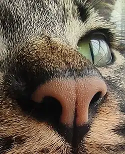 O olfato é fundamental para que o gato conheça o meio ambiente.[127] Um gato doméstico possui o olfato 14 vezes mais potente e duas vezes mais células receptoras que os humanos, portando 19 milhões de terminações nervosas ligadas ao cheiro, portanto, podendo sentir odores dos quais um ser humano nem sequer registra ou reconhece.[128]