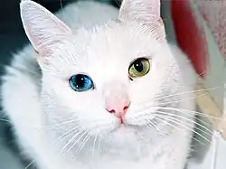 Existe uma crença de que os gatos brancos de olhos azuis são surdos, a não ser que tenham um olho de cada cor, característica conhecida por heterocromia, cujos portadores são denominados gatos de olhos ímpar. Isto está certo em parte, já que há uma maior probabilidade de gatos com essas características físicas serem também surdos, mas este fato não é determinante.[31] O gene da surdez é próprio dos gatos brancos, chama-se alelo w, e é o causador da coloração branca e da surdez nos gatos. Nem todos os gatos brancos são surdos, só são os que apresentam o tal gene. O gene w faz com que o gato seja branco, ainda que seus genes digam que ele é um gato escuro; este gene tem a peculiaridade de "mascarar" o resto das colorações para fazê-los brancos.[81] Além disso, estes gatos só têm os olhos azuis ou verdes. Outra característica genética é o fato de, em alguns animais, os dentes caninos da mandíbula superior serem proeminentes, semelhantemente ao observado nos fósseis do tigre-dentes-de-sabre.[31]