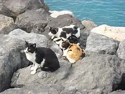 Devido ao fato de sua domesticação ser relativamente recente, quando necessário os gatos convertem-se facilmente à vida selvagem, passando a viver em ambientes silvestres. Gatos que nasceram ou cresceram em meio selvagem, sem manterem contato direto com seres humanos, costumam se unir em agrupamentos formados por diversos animais. Os animais que vivem nessa situação recebem o nome de gatos ferais.[148][31][149] Esses animais costumam formar colônias nas quais vivem por meio de caça a pequenos animais como aves e roedores.[148] Por crescerem de forma isolada, eles costumam apresentar agressividade e dificilmente aceitam contato com humanos, o que torna sua domesticação ocorrência rara e de elevado nível de dificuldade.[150] Suas colônias podem apresentar diferentes tamanhos, variando desde grandes colônias, com a presença de 25 ou mais gatos; agrupamentos médios contendo 10 a 25 indivíduos; ou ainda, pequenos grupos compostos por menos de 10 animais.[151] Tais colônias usualmente se localizam em áreas afastadas dos centros urbanos; contudo, não é rara a presença de agrupamentos de gatos ferais ocupando parques e grandes terrenos baldios das áreas urbanas.[148]