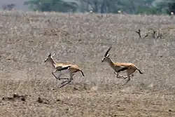 Elas podem correr a velocidades de 95 km/h durante cerca de quinze segundos e há registro de velocidades superiores a 100 km/h, ao escapar de predadores, como o guepardo (chita). As gazelas podem saltar verticalmente no ar. A gazela-de-thomson tem listras pretas na face e no corpo, o que ajuda a disfarçar a silhueta do animal, dificultando que seja visto à distância. Os machos e as fêmeas têm chifres, mas os das fêmeas são mais curtos. Eles se alimentam de gramíneas que outros animais de pasto deixam para trás.