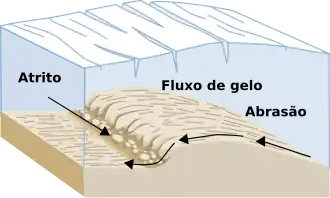 À medida que a geleira flui sobre a superfície fraturada do leito de rocha, arrasta consigo blocos de rocha que incorpora ao gelo. Este processo conhecido como atrito, produz-se quando a água de fusão penetra nas fendas e diaclases do leito de rocha e do fundo da geleira e se congela. Conforme a água se expande, atua como uma alavanca que solta a rocha, levantando-a. Desta maneira que os sedimentos de todos os tamanhos passam a formar parte da carga da geleira.[7]