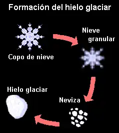 As geleiras se formam em áreas onde se acumula mais neve no inverno que se derrete no verão. Quando as temperaturas se mantêm abaixo do ponto de congelamento, a neve caída muda sua estrutura já que a evaporação e a recondensação da água causa a recristalização para formar grânulos de gelo menores, espessos e de forma esférica. Este tipo de neve recristalizada é conhecido por nevado. À medida que a neve se acumula e se converte em nevado, as camadas mais profundas são submetidas às pressões cada vez mais intensas. Quando as camadas de gelo e neve têm espessuras que alcançam várias dezenas de metros, o peso é tal que a nevada começa a desenvolver cristais de gelo maiores.