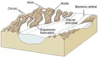 Além das características que as geleiras criam em um terreno montanhoso, também é possível encontrar cristas sinuosos de bordos aguçados que recebem o nome de arestas e picos piramidais e agudos designados por espigões.