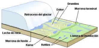 Quando uma geleira diminui o seu tamanho até chegar a um ponto crítico, o fluxo detém-se e o gelo para. Entretanto, as águas de fusão que correm por cima, no interior e por baixo do gelo, deixam depósitos de sedimentos estratificados. Por isso, à medida que o gelo vai-se derretendo, vai deixando depósitos estratificados em forma de colinas, terraços e cúmulos. Este tipo de depósito é conhecido como depósito em contacto com o gelo.
