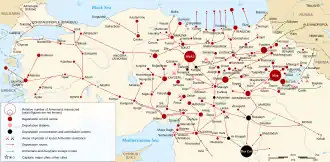 Os armênios foram levados para a cidade síria de Deir ez-Zor e para o deserto em redor. Evidências sugerem que o governo otomano não forneceu quaisquer instalações ou suprimentos para sustentar os armênios durante a sua deportação, nem quando eles chegaram.[66] Em agosto de 1915, o New York Times repetiu um relatório que reportava que "nas estradas e no Eufrates estão espalhados os cadáveres dos exilados, e os que sobrevivem estão condenados a uma morte certa. É um plano para exterminar todo o povo armênio".[67] Os massacres priorizavam a elite, muito embora, ao final do genocídio, a maior parte da comunidade armênia foi afetada.[68]