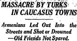- ↑ Armenians are sent to perish in desert; Turks accused of plan to exterminate whole population; people of Karahissar massacred. New York Times. 18 de agosto de 1915. Consultado em 16 de setembro de 2007.