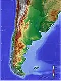 | Relevo | planícies dos Pampas (centro-oeste), da Mesopotâmia (nordeste) e do Chaco (norte), separadas por um planalto; cordilheira dos Andes (oeste); mesetas escalonadas com depressões (sudeste). |