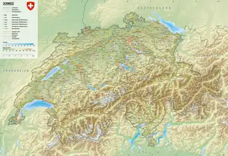 A paisagem suíça é caracterizada pelos Alpes, uma alta cadeia montanhosa que se estende pelo centro-sul do país. Entre os altos picos dos Alpes suíços, o mais alto dos quais é o Pico Dufour, de 4364 m, encontram-se inúmeros vales, alguns com geleiras. Delas, as nascentes de muitos rios europeus como o Reno, o Ródano, o Inn, o Aar ou o Tessino descem para lagos como o Léman, o de Zurique, o Neuchâtel e o de Constança e continuam a descer.