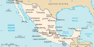 Localizado na América do Norte e de forma aproximadamente triangular, o México estende-se por mais de 3000 km de noroeste a sudeste. A sua largura varia entre mais de 2000 km no norte e menos de 220 km no istmo de Tehuantepece, no sul. O México tem litorais em duas grandes massas de água: o oceano Pacífico (com o golfo da Califórnia entre o continente e a península da alta Califórnia) a ocidente e, a oriente, o golfo do México e o mar das Caraíbas, que conduzem ao oceano Atlântico. Nos litorais encontram-se planícies costeiras, ao passo que o México central consiste de planaltos elevados e montanhas escarpadas, incluindo vulcões, o mais elevado dos quais é o Pico de Orizaba, com 5610 m de altitude.