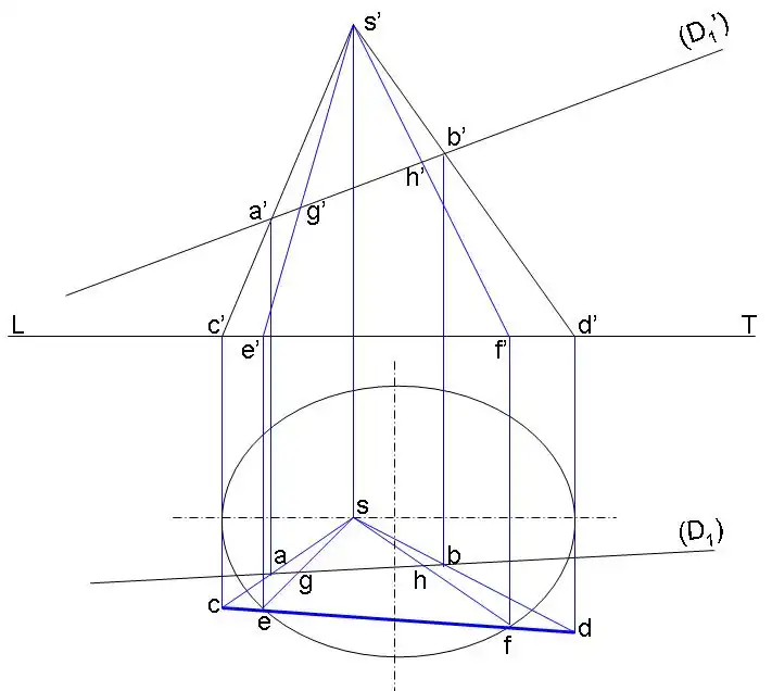Desenho realizado com recurso a dois pontos de vista, uma frontal e outra horizontal, sendo estas duas vistas separadas por uma linha de fundo (LT), os pontos de intersecção estão representados em {G,H}.
