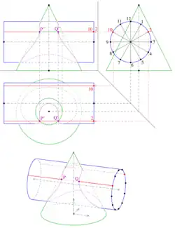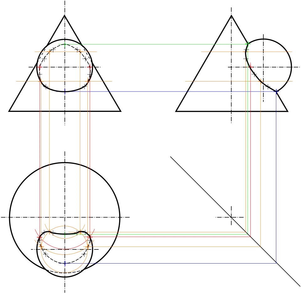A intersecção de dois volumes (por exemplo, uma abertura de furo na superfície ou duas peças soldadas) segue geralmente uma curva “complexa”. Para desenhar esta curva é necessário identificar os pontos em duas projecções: o ponto pertence a ambos os volumes, uma das vistas dará a sua dimensão, a outra a sua distância.