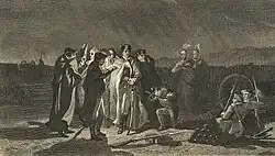 Washington primeiro ordenou uma busca de sessenta milhas por barcos de Durham (en) para transportar seu exército, e ordenou a destruição de embarcações que poderiam ser usadas pelos britânicos.[126] Cruzou o Rio Delaware na noite de 25-26 de dezembro de 1776 e arriscou ser capturado ao vigiar a costa de Jersey. Seus homens seguiram através do rio obstruído pelo gelo, expostos ao granizo e a neve, pela balsa de McConkey (en), com quarenta homens por embarcação. O vento agitou as águas e eles foram bombardeados pelo granizo, mas por volta das 3h00min do dia 26 de dezembro conseguiram atravessar sem sofrer perdas.[127] Henry Knox estava atrasado, gerenciando cavalos assustados e cerca de dezoito canhões de campanha em balsas de fundo achatado. Cadwalader e Ewing não conseguiram cruzar devido ao gelo e às fortes correntes, e Washington, que lhes aguardava, duvidou de seu ataque planejado a Trenton. Assim que Knox chegou, Washington seguiu para Trenton, levando apenas suas tropas contra os hessianos em vez de correr o risco de ser visto retornando seu exército para a Pensilvânia.[128]