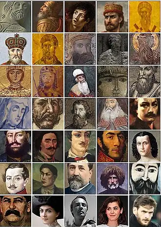 Farnabazo I • Farasmanes I • Radamisto • Farasmanes II • Pedro, o Ibérico • Vactangue I • Hilarião, o Ibérico • João Tornício • David III, o Grande • Jorge, o Hagiorita • Imperatriz Maria • David IV, o Restaurador • Shota Rustaveli • Tamara, o Grande • Simão I, o Grande • Rainha Ketevan • Jorge Saakadze • Archil II • Antim, o Ibérico • David Guramishvili • Heráclio II • Salomão I • Besiki • General Bagration • Nino da Mingrélia • Alexandre Chavchavadze • Nicolau Baratashvili • Ilia Chavchavadze • Vazha-Pshavela • Niko Pirosmani • Josef Stalin • Mary Eristavi • George Balanchine • Katie Melua • Khatia Buniatishvili | |