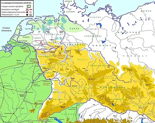 Nos dois anos seguintes, Germânico liderou suas legiões através do Reno contra as tribos germânicas e enfrentou as forças de Armínio e seus aliados. Tácito afirma que o objetivo destas campanhas era vingar a derrota sofrida por Varo na Batalha da Floresta de Teutoburgo e não aumentar o território romano.[33][46]