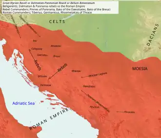 Não muito depois da chegada de Germânico à Panônia, Severo foi atacado na Mésia, mas conseguiu repelir os rebeldes. Quando Germânico chegou, os rebeldes já haviam recuado para suas fortalezas nas montanhas, a partir de onde lançavam raides regularmente. Os romanos estavam pouco preparados taticamente para enfrentar esses ataques rápidos e, por isso, Tibério preferiu utilizar suas forças auxiliares e dividiu seu exército em unidades menores para ocupar mais território. Tibério parece ter conduzido então uma guerra de atrito contra os rebeldes, entocados em suas fortes posições defensivas. Além disto, os romanos começaram a expulsar os rebeldes das regiões baixas e ofereceram o perdão para todas as tribos que abandonassem suas armas; todo o território foi destruído numa política de terra arrasada que Tibério acreditava ser suficiente para subjugar o inimigo pela fome. Apesar de a maioria destes destacamentos menores não ter enfrentado nenhuma batalha neste estágio da guerra, Germânico derrotou os mazaei, uma das muitas tribos dálmatas.[17][18]