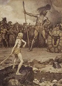 A Bíblia fala também de Gogue e Magogue, que mais tarde entrou no folclore europeu, e da famosa batalha entre David e o filisteu Golias. Embora Golias seja frequentemente retratado como um gigante nas recontagens da narrativa bíblica, parece ser significativamente mais pequeno do que outros gigantes, bíblicos ou não. A versão do Texto Massorético do Livro de Samuel confere-lhes seis côvados de altura e um palmo (possivelmente 313–372 centimetros (10 ft 3 in – 12 ft 2 in)),[11] enquanto a Septuaginta, o historiador judeu do século I Flávio Josefo e os Manuscritos do Mar Morto dos séculos II e I a.C. dão a altura de Golias como quatro côvados e um palmo (possivelmente 216–258 centimetros (7 ft 1 in – 8 ft 6 in)).[12] Para efeito de comparação, os anaquins são descritos como fazerem os israelitas parecerem gafanhotos.[13] Ver também Gibborim.