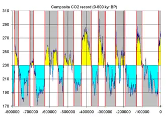 - ↑ Augustin, Laurent; et al. (2004). «Eight glacial cycles from an Antarctic ice core». Nature. 429 (6992): 623–8. Bibcode:2004Natur.429..623A. PMID 15190344. doi:10.1038/nature02599