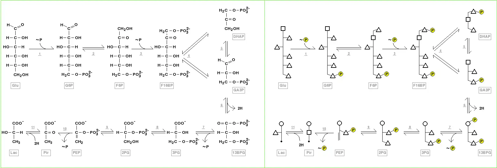 Os intermediários da glicólise apresentados utilizando projeções de Fischer mostram as mudanças químicas passo a passo. Essa imagem pode ser comparada à representação através do modelo poligonal.[4] Outra comparação de projeções de Fischer e o modelo poligonal na glicólise é mostrado em vídeo.[5]