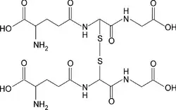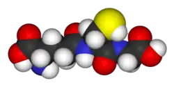 Glutationa, glutationo ou glutatião (γ-glutamilcisteinilglicina) é um tripeptídeo linear, com uma ligação 'Y-amida incomum, constituído por três aminoácidos: ácido glutâmico, cisteína e glicina, sendo o grupo tiol da cisteína o local ativo responsável pelas suas propriedades bioquímicas. É um antioxidante hidrossolúvel que está profusamente distribuída em tecidos animais, vegetais e em microrganismos, existe, na maioria das células, em concentrações compreendidas entre 1 e 8 mM, estando, geralmente, na sua maior quantidade no fígado. É o tiol mais prevalente e o mais abundante peptídeo de baixo peso molecular. Ao longo dos processos evolutivos foi adaptada para realizar uma gama diversa de funções, participando de vários processos metabólicos[3].