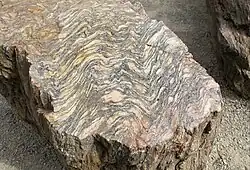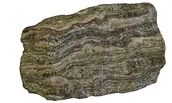 Migmatito é um gneisse que consiste em dois ou mais tipos de rochas distintos, um dos quais tem a aparência de um gneisse comum (o mesossoma), e outro que tem a aparência de uma rocha intrusiva como pegmatito, aplito ou granito (o leucossoma).[10] Migmatitos são frequentemente interpretados como rochas que foram parcialmente fundidas, com o leucossoma representando o fundido rico em sílica e o mesossoma a rocha original que ainda não sofreu fusão.[11]