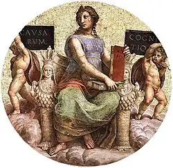 Um medalhão que representa a alegoria da Filosofia, parte do afresco "A Escola de Atenas" de Rafael Sanzio.