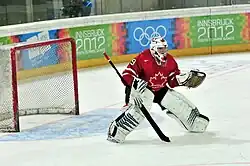 No hóquei no gelo, os goleiros são mais comumente chamados em inglês de goaltenders ou simplesmente goalies.[5] Eles defendem a zona de gol (rede) de seu time impedindo que os chutes do disco entrem na baliza (goal cage), evitando assim que o time adversário marque. O goleiro geralmente joga dentro ou perto da área em frente à rede, chamada de goal crease. Devido à força dos chutes, o goleiro usa equipamentos específicos projetados para proteger o corpo do impacto direto. Como acontece com a maioria dos outros esportes, apenas um goleiro pode estar na área de jogo de cada equipe por vez.