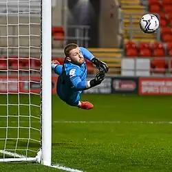Um goleiro de futebol saltando para tentar fazer uma defesa.
