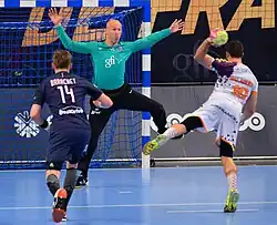 Goleiro de handebol saltando para tentar fazer uma defesa.