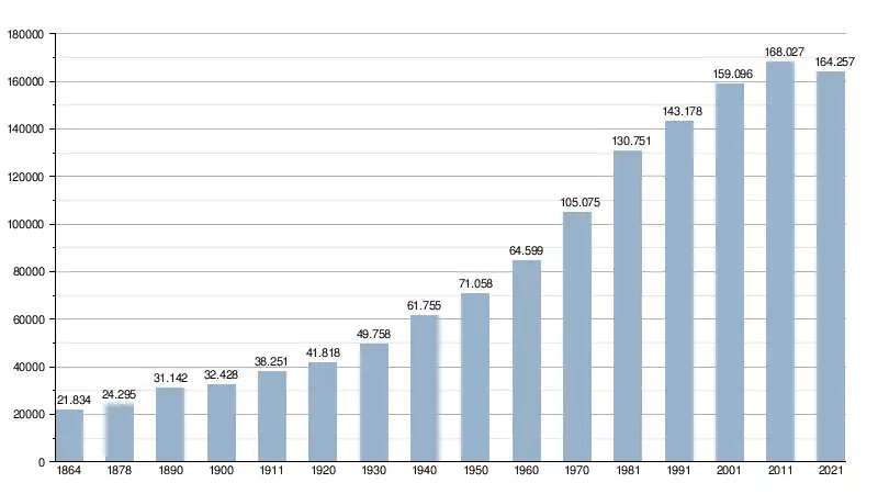 | 1864 | 1878 | 1890 | 1900 | 1911 | 1920 | 1930 | 1940 | 1950 | 1960 | 1970 | 1981 | 1991 | 2001 | 2011 | 2021 |