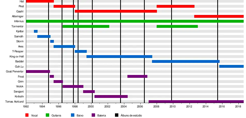 | Ex-integrantes | Goat Pervertor Hat Samoth Frost Ares Grim Gaahl King ov Hell Frank Watkins |
