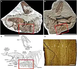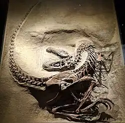 - ↑ Reisdorf, A.G.; Wuttke, M. (2012). «Re-evaluating Moodie's Opisthotonic-Posture Hypothesis in fossil vertebrates. Part I: Reptiles – The taphonomy of the bipedal dinosaurs Compsognathus longipes and Juravenator starki from the Solnhofen Archipelago (Jurassic, Germany)». Palaeobiodiversity and Palaeoenvironments (em inglês). 92: 119–168. doi:10.1007/s12549-011-0068-y
