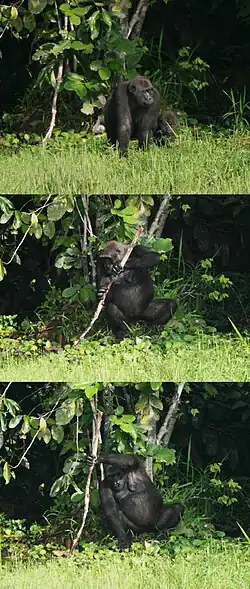 - ↑ Breuer T; Ndoundou-Hockemba M; Fishlock V (2005). «First Observation of Tool Use in Wild Gorillas». PLoS Biol. 3 (11): e380. PMID 16187795. doi:10.1371/journal.pbio.0030380