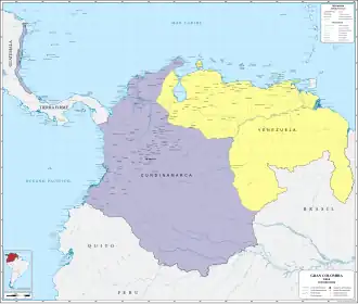 Essa república existiu legalmente entre 1821 e 1831 e foi criada a partir da união das antigas entidades coloniais do Vice-Reino de Nova Granada, Capitania Geral da Venezuela, Província de Quito e Província Livre de Guayaquil.[9] Seu território correspondia aos territórios das atuais repúblicas da Colômbia, Equador, Panamá e Venezuela (incluindo a Guiana Essequiba, uma reivindicação guiano-venezuelana); e outros territórios que se tornariam parte do Brasil, Peru e Nicarágua por acordos internacionais celebrados entre estes países e de repúblicas que surgiriam da dissolução da Grã-Colômbia.