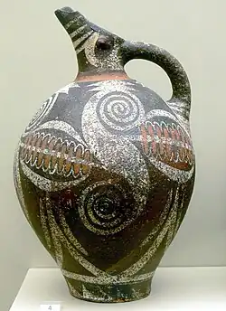Civilização micênica (português brasileiro) ou civilização micénica (português europeu) é um termo utilizado para descrever a última fase da Idade do Bronze na Grécia Antiga, abrangendo o período de aproximadamente 1 600–1 100 a.C. Representa a primeira civilização avançada na Grécia continental, com seus estados palacianos, organização urbana, obras de arte e sistema de escrita.[47] O local mais proeminente foi Micenas, na Argólida, pela qual a cultura desta é nomeada. Outros centros de poder que surgiram incluíram Pilos, Tirinto e Mideia no Peloponeso, Orcômeno, Tebas e Atenas na Grécia Central, e Iolcos na Tessália. Povoados de influência micênica também apareceram em Epiro,[48][49] na Macedônia,[50][51] nas ilhas do Mar Egeu, na costa da Anatólia, no Levante,[52] no Chipre[53] e na Itália.[54]